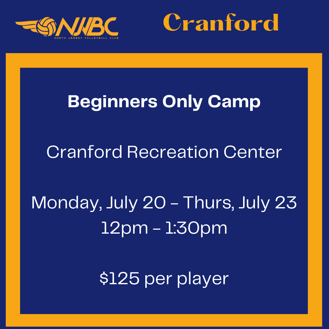 This volleyball camp takes place at Cranford Recreation Center, 375 Centennial Ave, Cranford, NJ. Choose one registration option below. Families who choose the cash option pay a non-refundable deposit now and receive a $15 discount by paying the remaining balance in cash at check-in on Day 1.