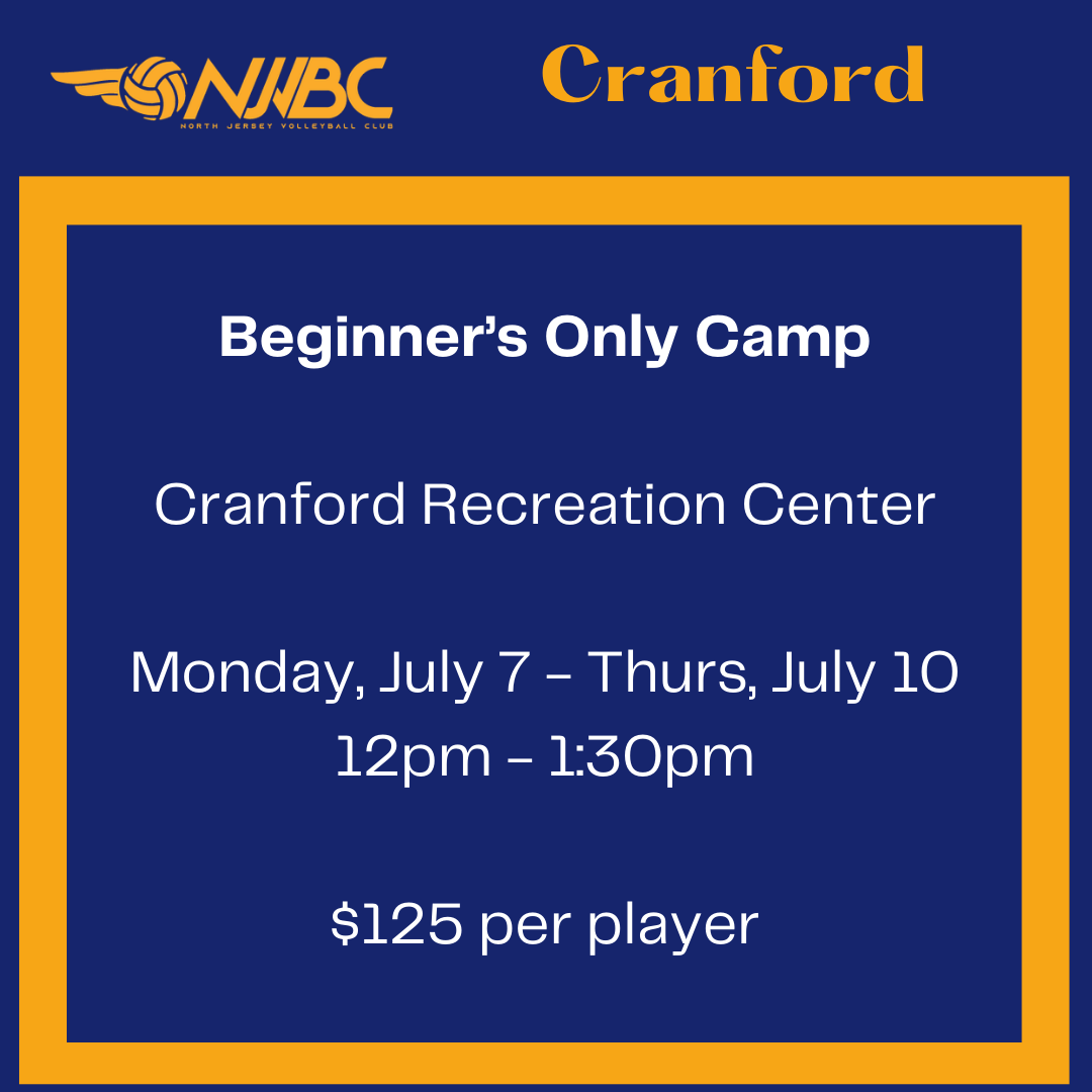 This volleyball camp takes place at Cranford Recreation Center, 375 Centennial Ave, Cranford, NJ. Choose one registration option below. Families who choose the cash option pay a non-refundable deposit now and receive a $15 discount by paying the remaining balance in cash at check-in on Day 1.