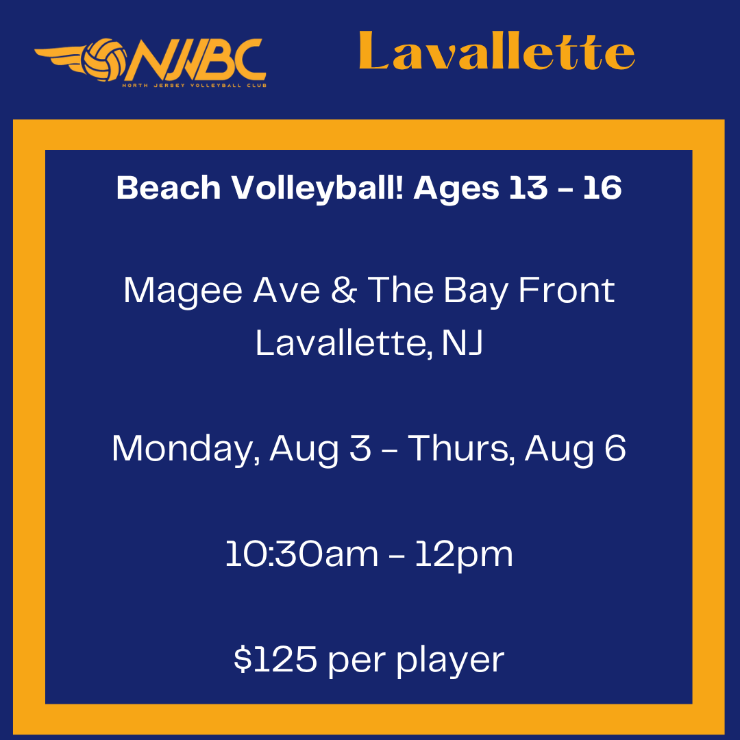 This outdoor beach volleyball clinic takes place in Lavallette. Choose one registration option below. Families who choose the cash option pay a non-refundable deposit now and receive a $15 discount by paying the remaining balance in cash at check-in on Day 1.