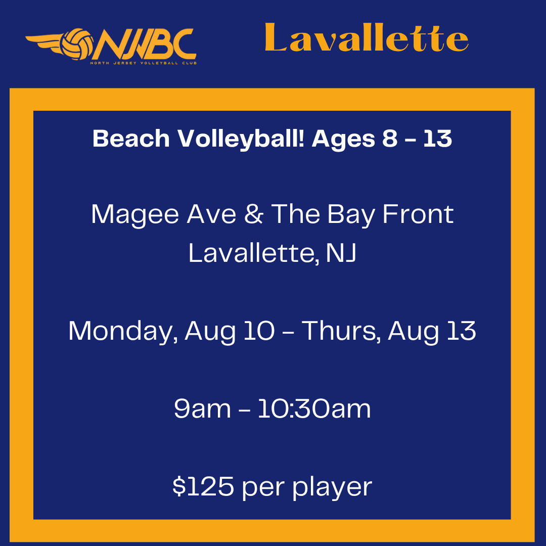 This outdoor beach volleyball clinic takes place in Lavallette. Choose one registration option below. Families who choose the cash option pay a non-refundable deposit now and receive a $15 discount by paying the remaining balance in cash at check-in on Day 1.